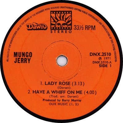 of the Mungo Jerry EPs proved popular the 'A' sides were put out as 45 rpm singles,