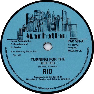 mystery. Manhattan was responsible for at least one record, a single by Rio, 'Turning For The Better' b/w 'Dagger To My Heart'. The single came out in 1979; Sam Mauger, who was kind enough to draw Manhattan to my attention and to supply the scan, says that it arrived at the radio station where he was working in or around June of that year, possibly in a batch of records from CBS. The single, which is in a Dance / Funk vein, had a catalogue number of PAC-501 and was pressed by Orlake. Sadly there doesn't seem to have been a PAC-502.