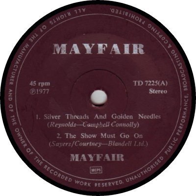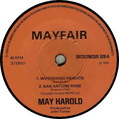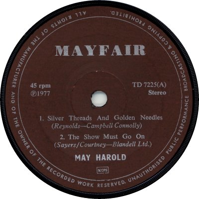 Mayfair appears to have been the label of Scottish Club / Cabaret singer May Harold; the only two records on the label that I have managed to trace were by her. The first, which was issued in 1977, was a three-track EP / maxi-single featuring 'Silver Threads And Golden Needles', 'The Show Must Go On' and 'Don't Cry For Me Argentina'. Its catalogue number, TD-7225, belongs to a series that was used by Craighall Studios (q.v.) of Edinburgh, and its label has a typically Craighall appearance. It can be found in two forms, one giving the artist as 'Mayfair' (1), the other crediting May Harold (2). 1979 saw the release of a four-track EP; the tracks on it were 'Wuthering Heights', San Antone Rose', 'You Needed Me' and 'Stephen'. Its catalogue number, SRTS/79/CUS-529, shows that it was one of SRT's custom recordings. As can be seen, the labels of that record were typical SRT basic-but-functional orange ones (3). Thanks to Dr. Doom and Klepsie of the 45cat site for bringing Mayfair to my attention; Dr. Doom kindly supplied the first scan, and another 45catter, Jimboo, provided the third. See also 'TD (Craighall Studios)', 'Ca Va', 'Road', and 'Phoenix Promotions'.